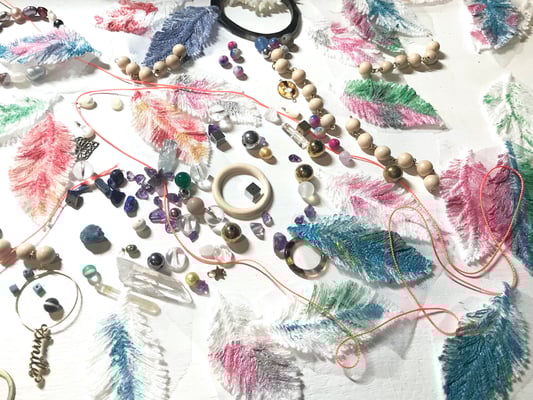 入院中の未就学の病児とご家族が制作参加。羽状の布にフィンガーペイントを施した。ギャラリーでは治療中の子供が受け取るビーズからイメージした作品を展示、病棟にはアヒルの親子の絵画への素材に組み込んで展示した。