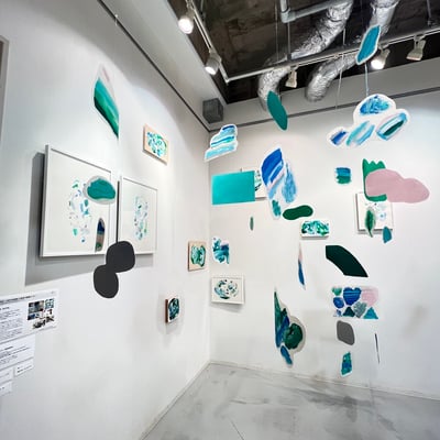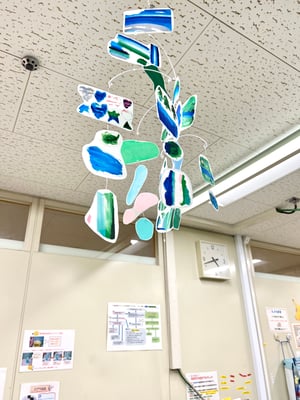 入院中の中高生を中心とした患者が制作参加。作家のカラーパレットを使用し絵の具を用いて各自パーツを制作した。それらのパーツで制作したモビールをギャラリーで展示。病院には小さなサイズのモビールに作り替え展示した