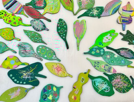 すべて色形の異なる葉のレリーフに患者やご家族が絵を描き入れることで参加。院内のプレイスペースで通院中の親子対象にワークショップを開催した。病院ではアーティスト制作の大きな動物のレリーフと組み合わせて、患者製作の葉っぱを一緒に壁面構成し展示した。