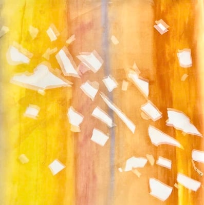 通院中の未就学の病児とご家族、入院中の重症心身障がい児に新聞をビリビリ破く遊びで制作参加いただいた。破いた新聞紙を模様に定着させた天然の染色の作品が完成。風にそよぐ作品は、ギャラリーの形をそのままに展示した。