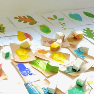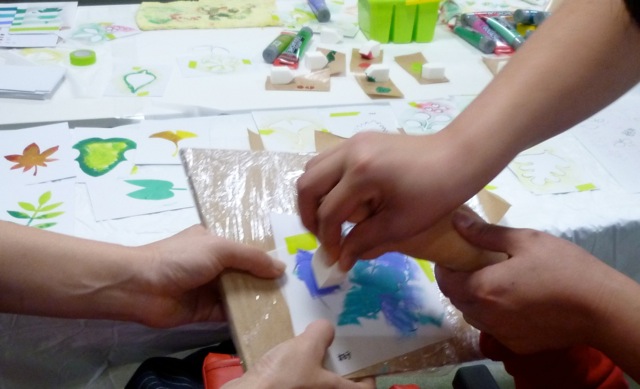 今回は、奈良の植生の様々な葉っぱや、正倉院に伝わる伝説の動物「花しか」を題材に障がいのあるお子様にも扱いが容易なステンシルで、色とりどりの葉っぱを集めさせていただきました。