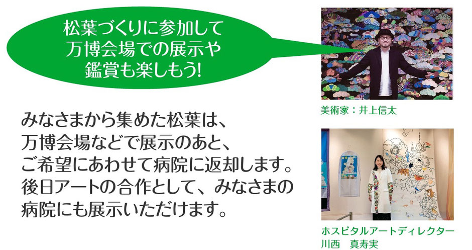 ただいま、「どこでも万博」と連携して、各地の医療機関に入院中のスペシャルキッズとご家族、周りの方々から「生命の松葉」を集めています。