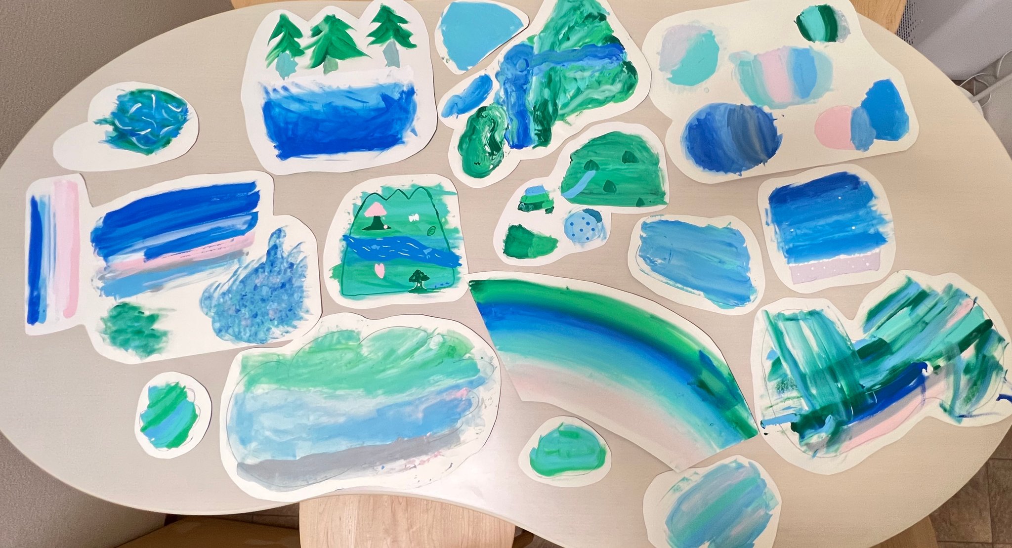 絵描きの尾柳佳枝さんが、作品に合わせてえらんだ色で、 病室で患者さんにつくっていただいたステキな作品たち。 ゆっくり動く2つのモビールにしています。 あなたにも「すきなながめ」をみつけてもらえますように。 〜キャプションより |