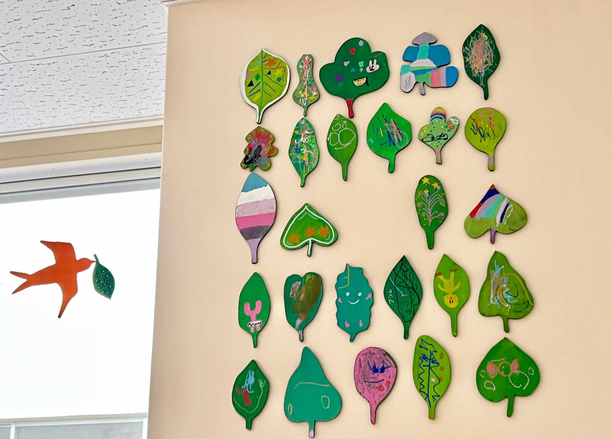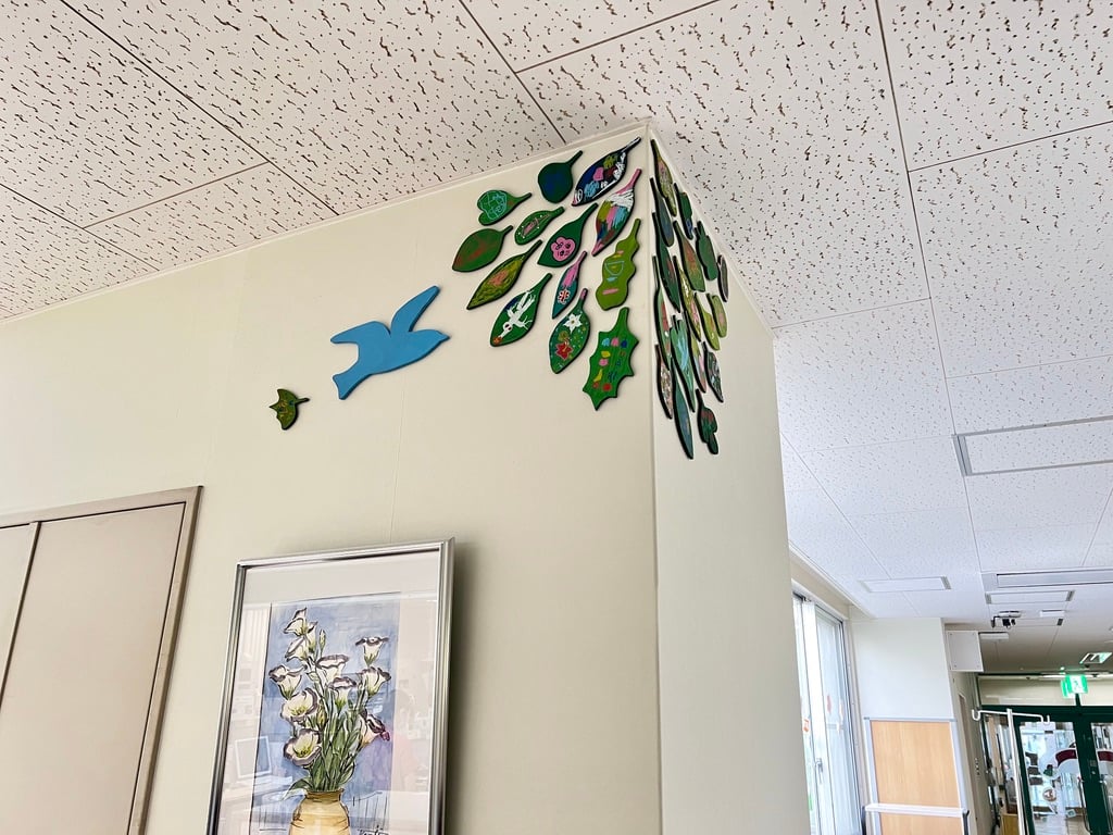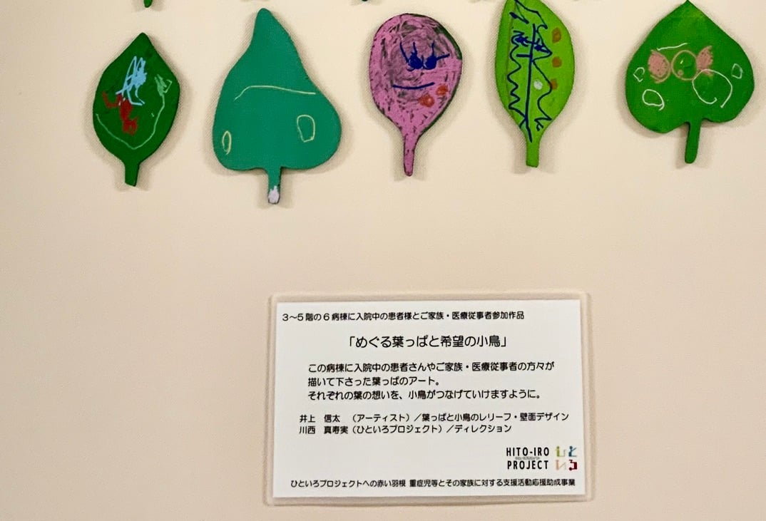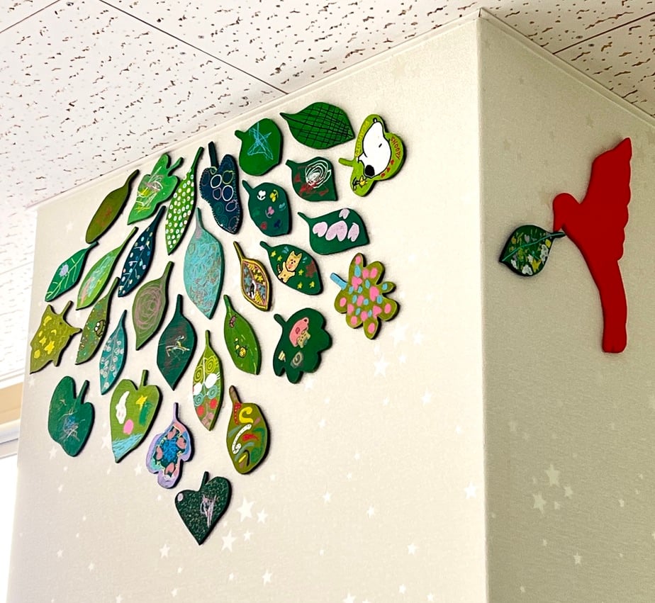 この病棟に入院中の患者さんやご家族・医療従事者の方々が 描いてくださった葉っぱのアート それぞれの葉の想いを、小鳥がつなげていきますように