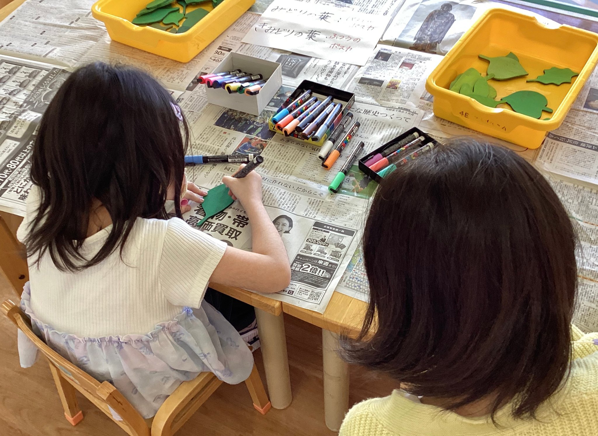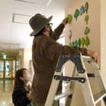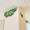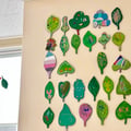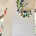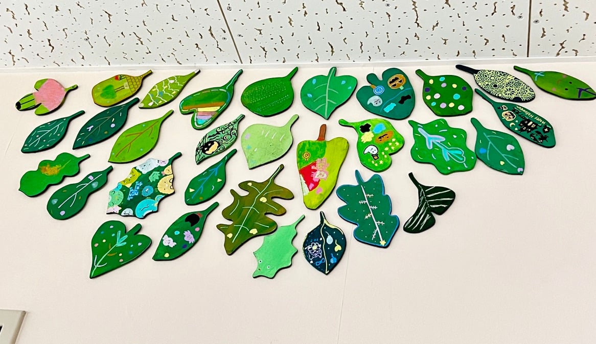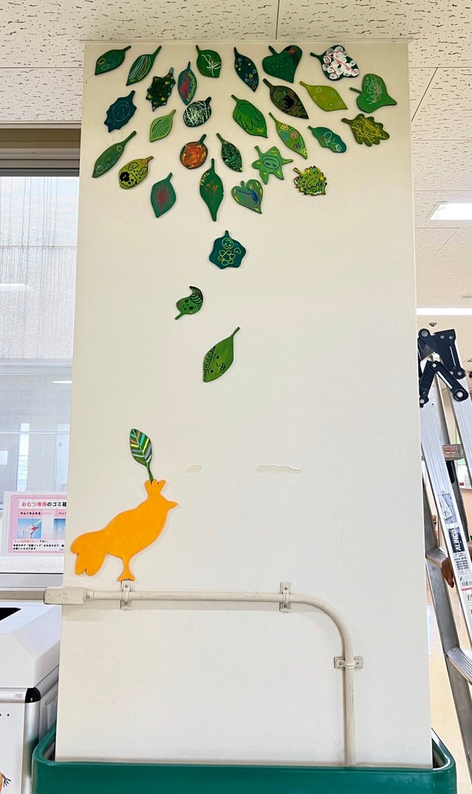 この病棟に入院中の患者さんやご家族・医療従事者の方々が 描いてくださった葉っぱのアート それぞれの葉の想いを、小鳥がつなげていきますように
