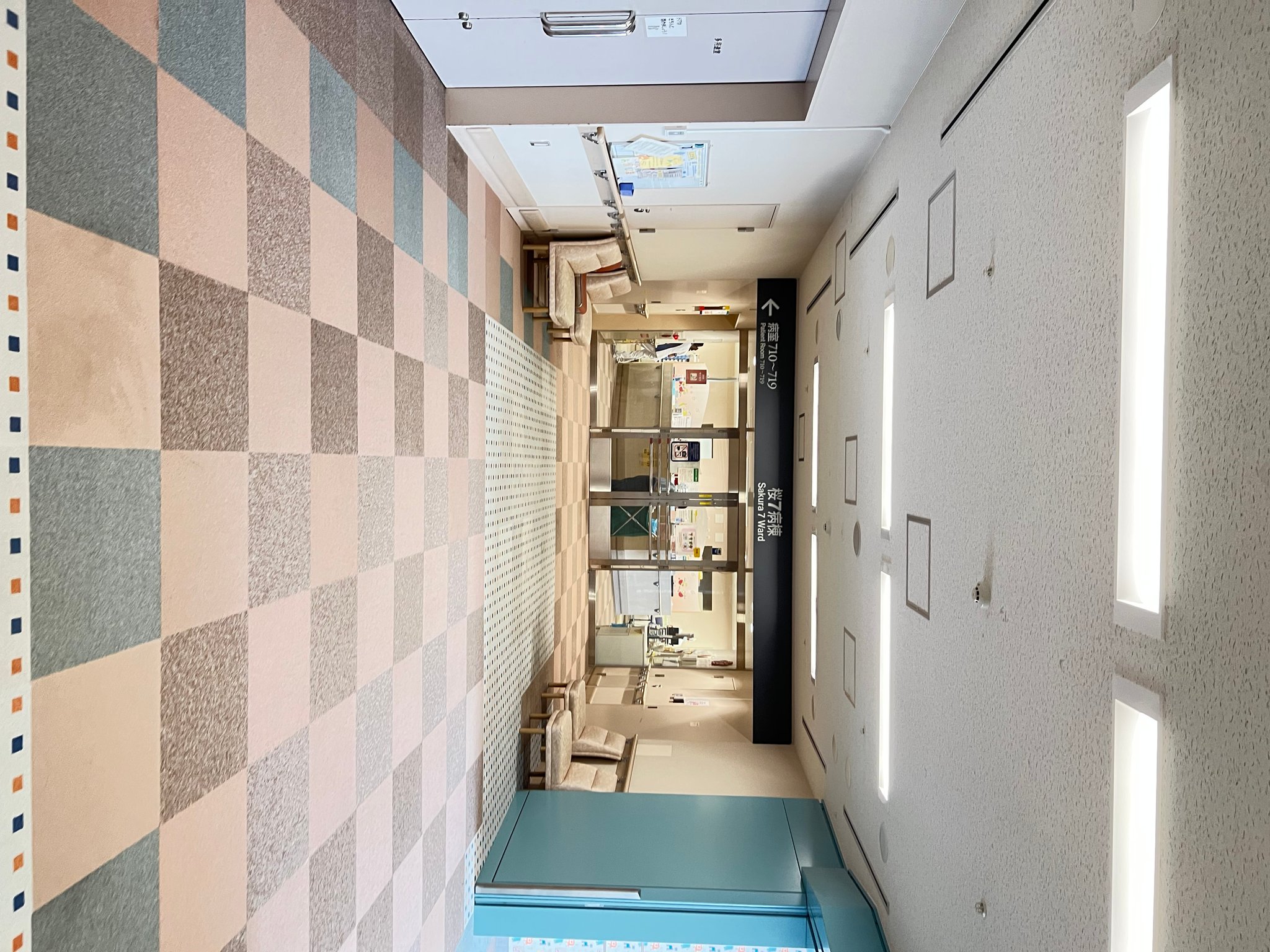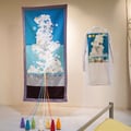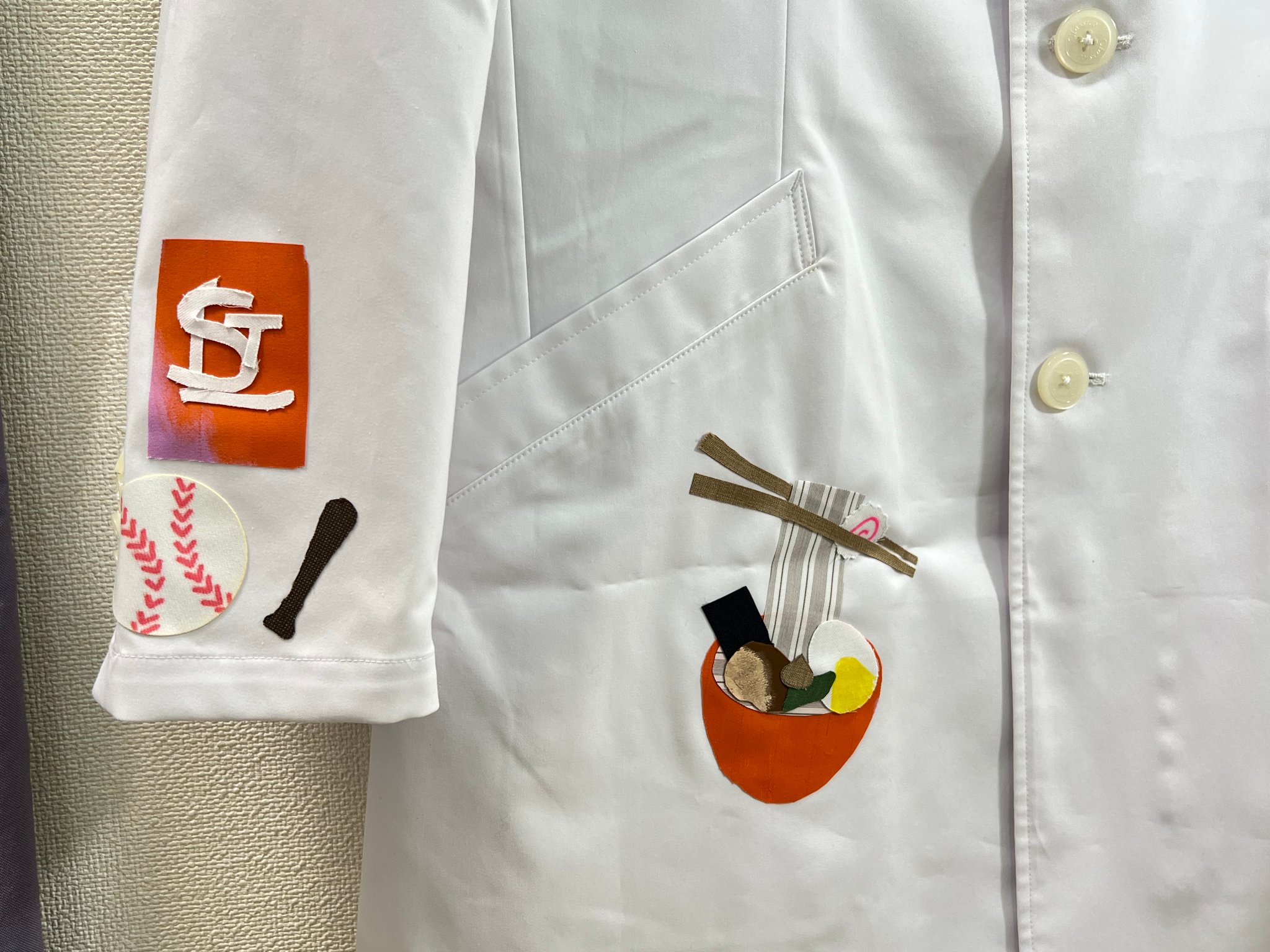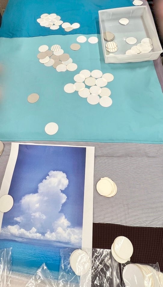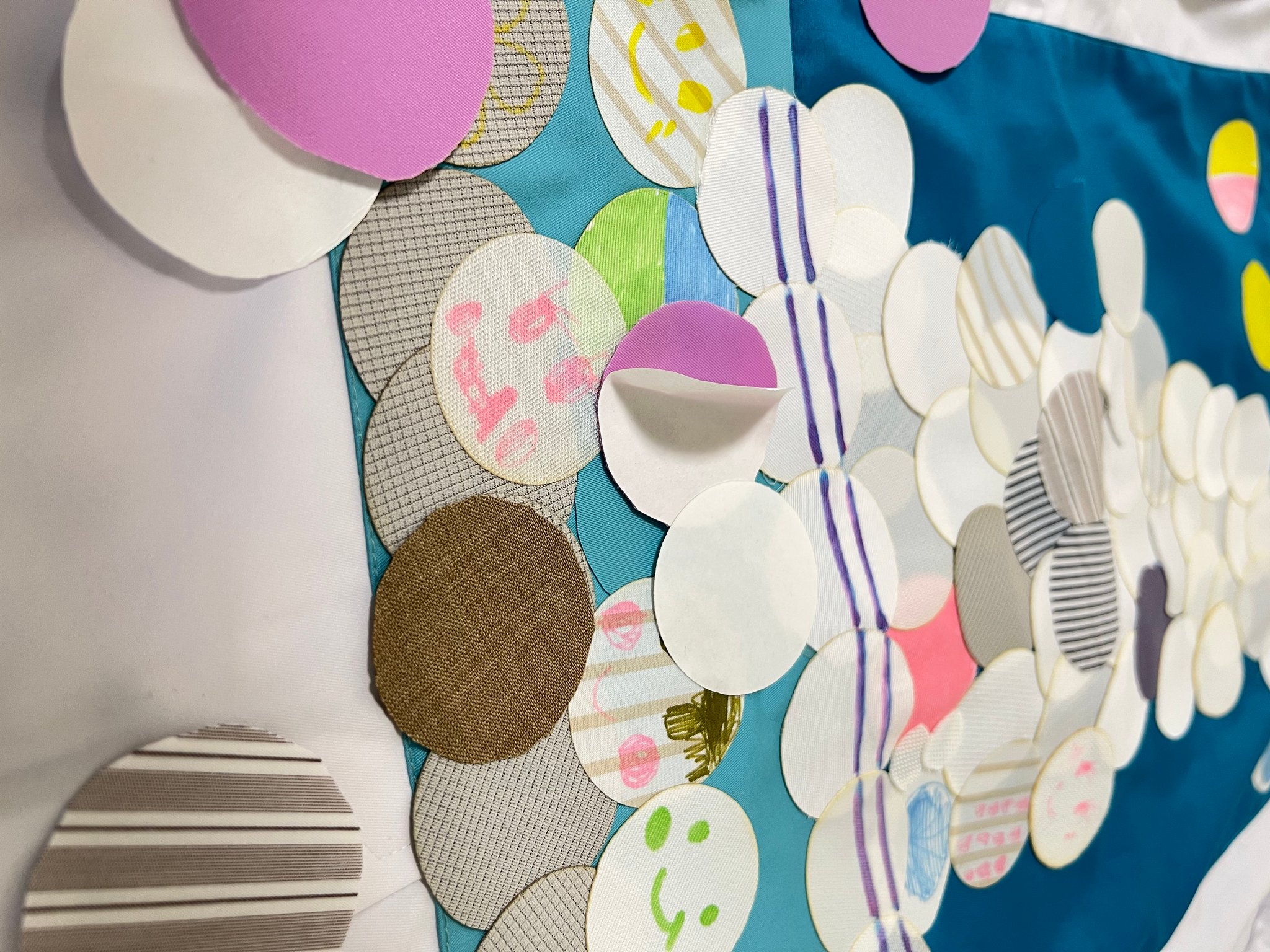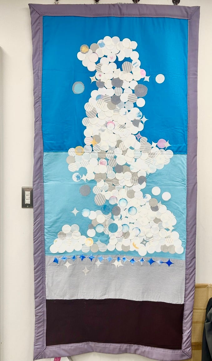 ファッションデザイナーのヒガシテッペイさんが、ドアと同じサイズのタペストリーをデザインしました。 病院からほど近い都島中学校で、原画通りの縫製を協力してもらい 続きを分教室の中学部の皆様が仕上げて、 完成した作品です。 雲の写真をじっくりみながら、たくさんの雲のシールをみんなで貼ったり 絵の具で色塗りしたり、大きなタベストリーにみんなで力を合わせて、 きらめく大きな雲が出来あがりました。 また、先生の白衣の背中にも、小学部の皆様で制作した青空と力強い雲がひろがりました。
