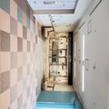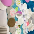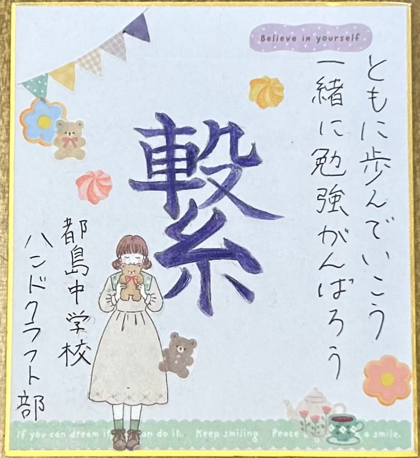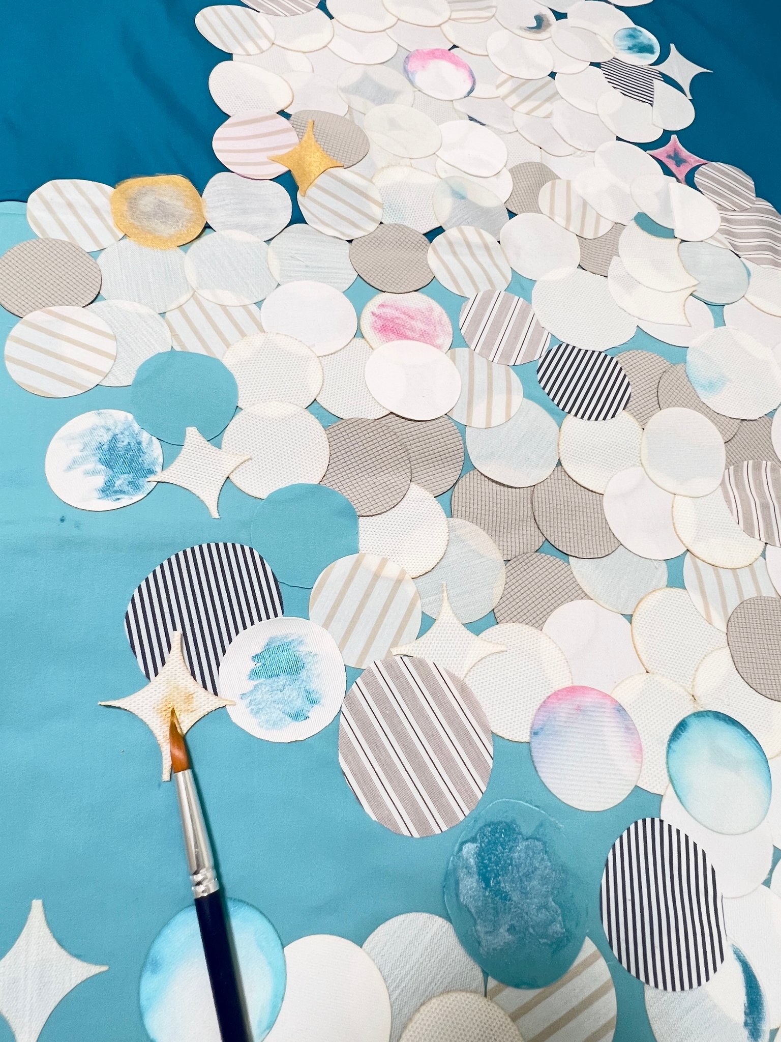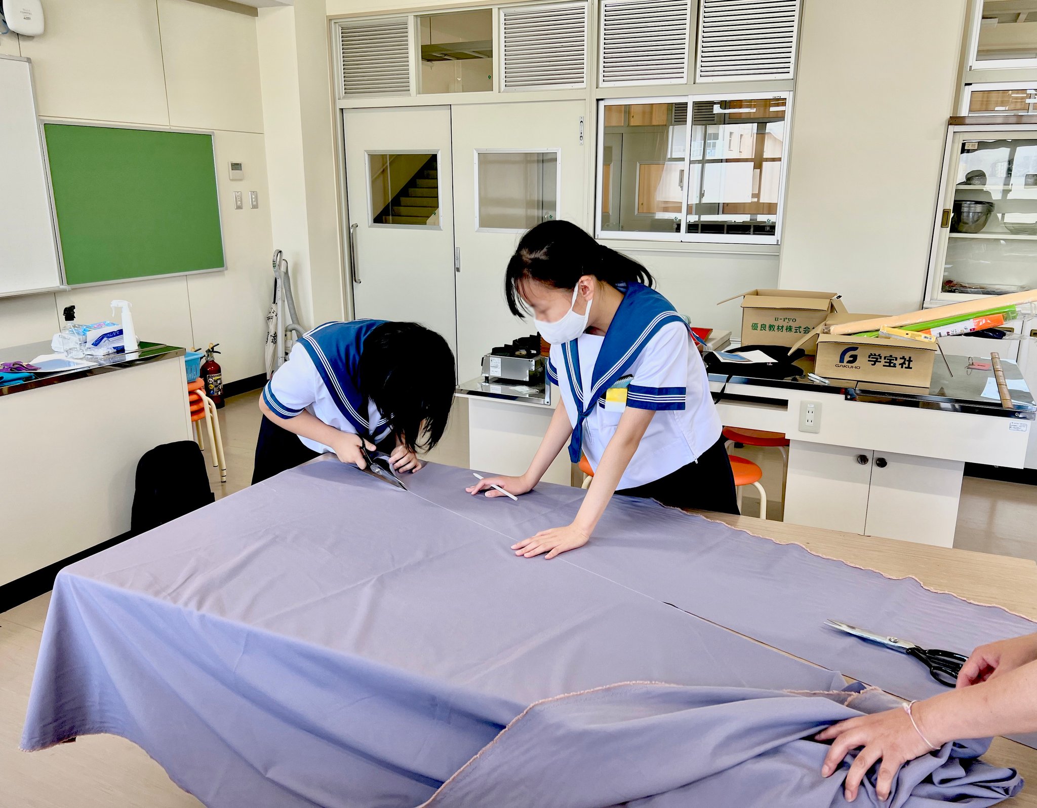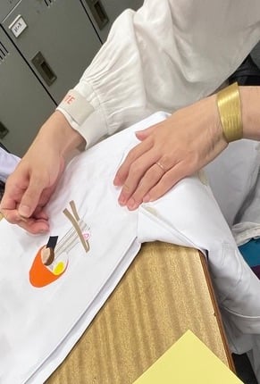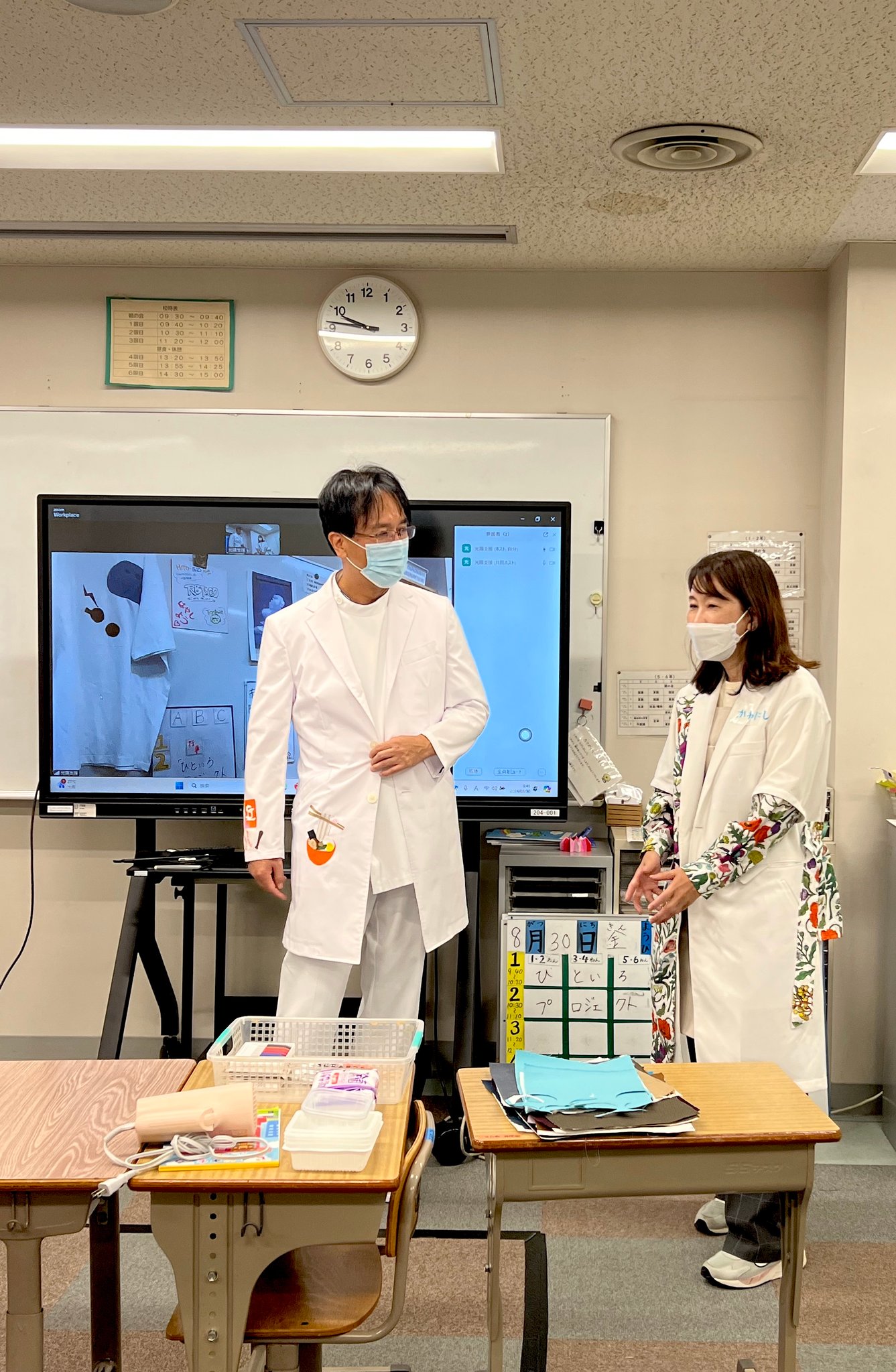 ファッションデザイナーのヒガシテッペイさんが、ドアと同じサイズのタペストリーをデザインしました。 病院からほど近い都島中学校で、原画通りの縫製を協力してもらい 続きを分教室の中学部の皆様が仕上げて、 完成した作品です。 雲の写真をじっくりみながら、たくさんの雲のシールをみんなで貼ったり 絵の具で色塗りしたり、大きなタベストリーにみんなで力を合わせて、 きらめく大きな雲が出来あがりました。 また、先生の白衣の背中にも、小学部の皆様で制作した青空と力強い雲がひろがりました。
